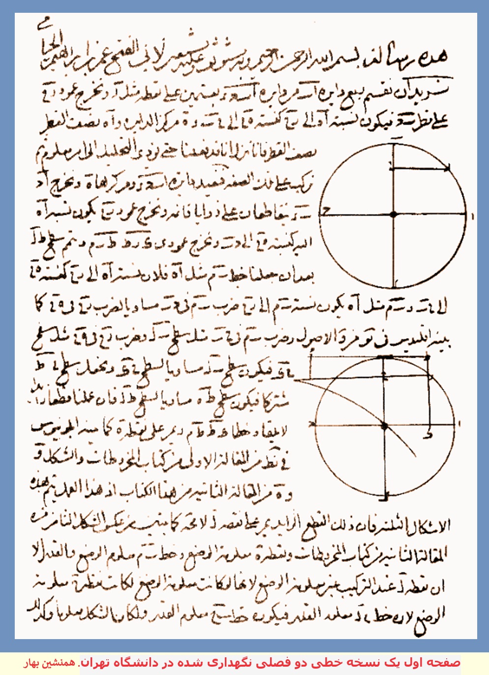 در سالهای دور که در میهن عزیزم بودم، در دانشگاه تهران تصویری از صفحه نخست یکی از رسالههای خَیاّم را دیدم که به موضوع حل معادلات درجه سه پرداخته بود. وی با روشی مبتنی بر تقاطع دایره و سهمی، انواعی خاص از معادلات درجه سه را حل کرده، نشان میداد امکان حل هندسی آن با خطکش و پرگار وجود ندارد. در مقاله مربوط به این بحث، صفحه مورد نظر را گذاشتهام.